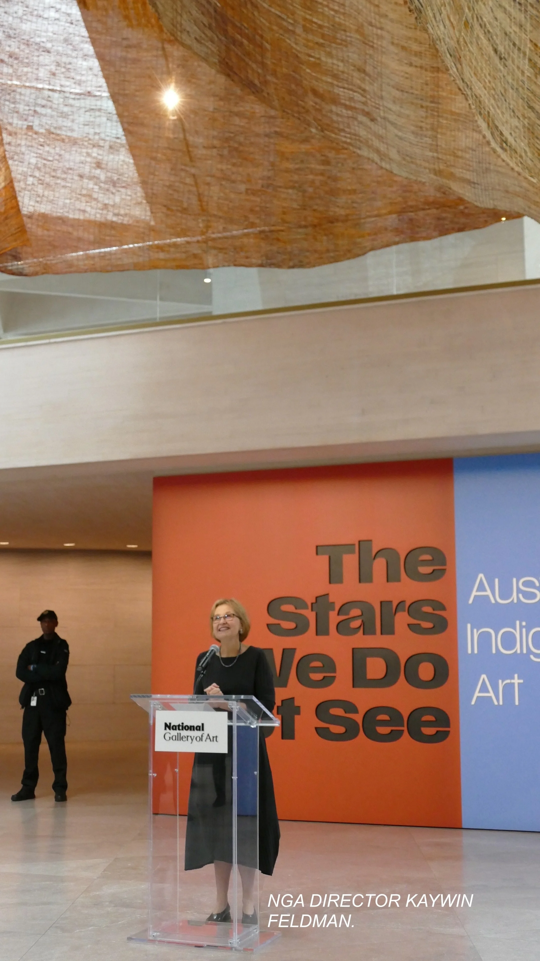 The current exhibition at the National Gallery, “The Stars We Do Not See” is a huge showcase of about 200 works by 130 Indigenous Australian artists (I.A.) The term “Aboriginal” which is a generalization meaning “natives from an earlier time “ is derogatory and no longer used. The exhibition, which may be viewed in the National Gallery of Art’s East Building until March 1, 2026, is fascinating, educational, and dazzling. A first reaction to the exhibition is to be impressed by bright colors and shapes, and the uniqueness of the ochre-bark paintings and tubular sculptures—some decorative, some practical (used as coffins!), as well as timeless designed jewelry, weavings, and important documentary photographs. Most works are drawn from the rich (I.A.) culture, many originating from family members and legends, and expressed within song and dance ceremonies. The show was introduced by Kaywin Feldman, NGA Director who highlighted one work, “Maningrida Fish Fence, 2023” which was an impressive example of woven fiber art installed in the lobby ceiling at the entrance to the show. It is a strangly beautiful symbol of winds, and spirits and woven by 14 female artists. Each of the artists was related to one another by history, totem, skin group, language, or family ties, according to the show’s catalogue. A few personal highlights of the show, and there are many, include a drawing “Wurundjeri Ceremony, 1823” by William Barak (1823-1903). The work shows the beauty of ancient times using natural elements from the land—with people costumed as animals and birds and dancing while holding traditional tools such as boomerangs. Another work by Timothy Cook (b. 1958) has contemporary compositional elements, such as converging circles symbolizing the moon, and the Yam (an important starchy root vegetable). The work also celebrates the harvest period when the celestial moon circles earth and when young men are renamed as adults. The Red Room is a protest space by Christian Thompson in 2021 called “Burdi Burdi” or (Fire Fire). Burdi is the word for fire in his father’s language, Bidjara, which has been endangered due to political oppression. The installation is a form of protest and calls for perseverance and resistance. (It was created during the time of Covid-19).